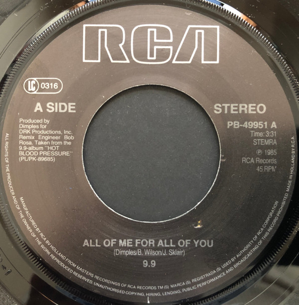 9.9 – All Of Me For All Of You / Little Bitty Woman (1985) – Very Good Plus (VG+)