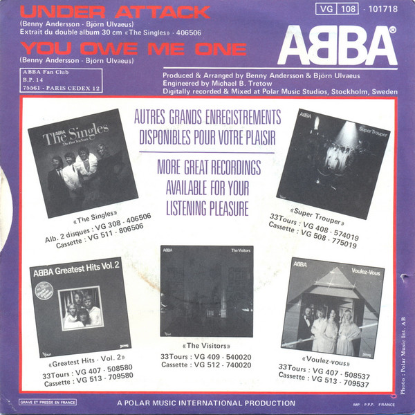 ABBA – Under Attack / You Owe Me One (1982) – Very Good Plus (VG+)