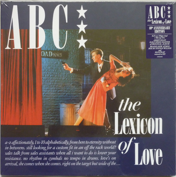 Issued in a glossy hardback 12 inch deluxe book with 4 pockets for the LPs and a middle leaf containing a slip-in pocket for the Blu-Ray disc in its cardboard sleeve. Each LP has its own printed inner sleeve but also a black die-cut poly-lined sleeve. There is a certificate of the half speed mastering. Hype sticker reads: ABC the Lexicon of Love 40th ANNIVERSARY EDITION 4LPs on 180gm vinyl 1 Blu-ray Disc ABBEY ROAD HALF SPEED MASTER of ORIGINAL ALBUM BRAND NEW ATMOS MIX BY STEVEN WILSON and MANTRAP restored in HD NTRS40X1 Made in the EU on rear artwork. MADE IN THE EU on blu-ray disc label. Blu-ray includes album audio in four 2023 mixes by Steven Wilson: – Dolby Atmos – DTS-HD 5.1 surround (96kHz/24-bit) – PCM stereo (96kHz/24-bit) – Instrumental PCM stereo The original stereo mix is not included because it is on [r=27857553]. The vinyl records do not have any individual matrix identifying numbers.