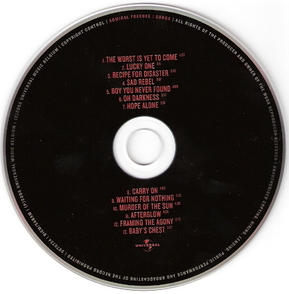 Back inlay: SABAM (C) Control / 987 0724 / (P)(C) 2005 Universal Music Belgium, A Universal Music Company. Disc: (C) 2005 Universal Music Belgium / Copyright Control Made in the EU. Recorded at Village Recorder, West L.A., CA. Overdubs at Shangri LA Studios, Malibu, CA. Overdubs at 4th Street Recording Studios, Santa Monica, CA. Mixed at Bay 7 Studios, North Hollywood, CA. Mastered at La Source Mastering, Paris. Catalog number printed as 9870724 on the spine & disc and as 987 0724 on the back sleeve & the booklet.