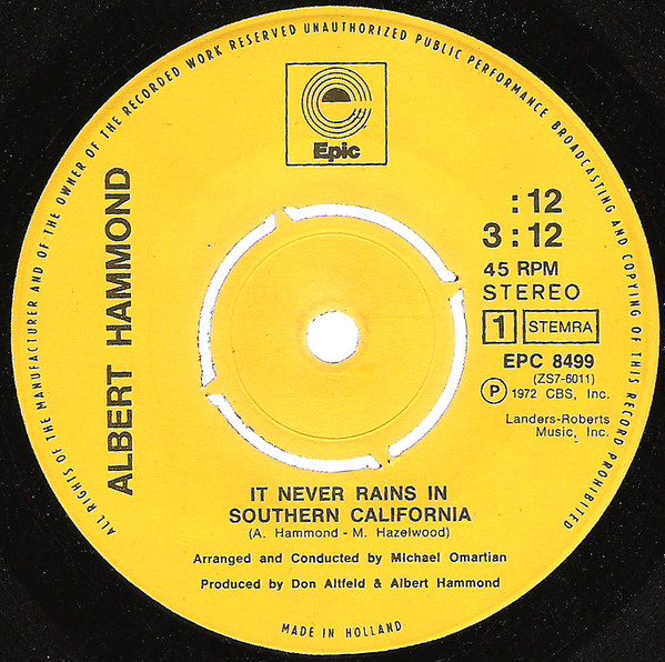 Albert Hammond – It Never Rains In Southern California (1972) – Very Good (VG)
