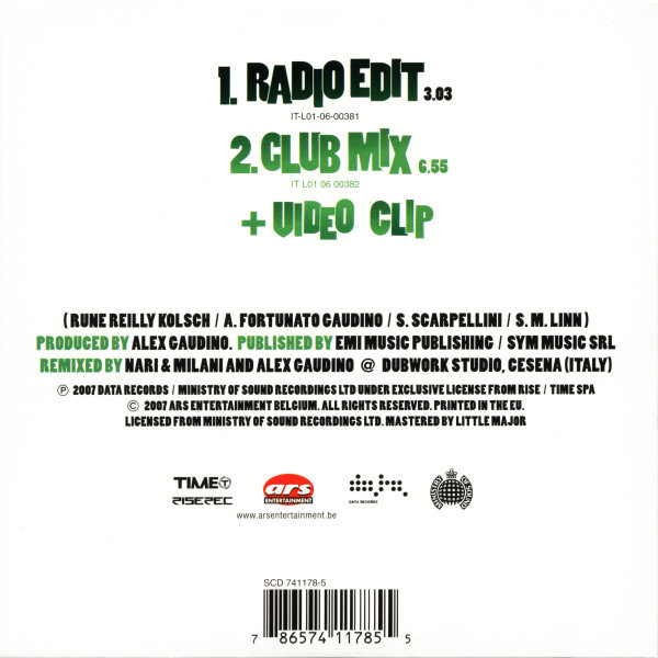 Published by EMI Music Publishing / Sym Music Srl. Remixed @ Dubwork Studio, Cesena (Italy). ℗ 2007 Data Records / Ministry Of Sound Recordings Ltd under exclusive license from Rise / Time Spa © 2007 ARS Entertainment Belgium Licensed from Ministry Of Sound Recordings Ltd. [CD] Made in EU Housed in a cardsleeve.