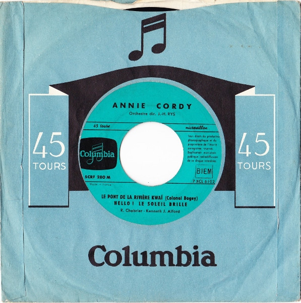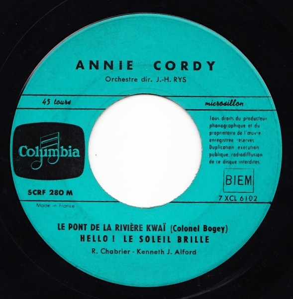 Annie Cordy – La Frotteuse De Parquet / Le Pont De La Rivière Kwaï (Colonel Bogey) Hello ! Le Soleil Brille (1958) – Very Good Plus (VG+)