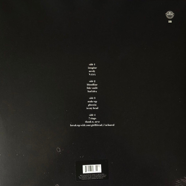 Exclusive to the artist’s online webstores and official retailers. Issued in a gatefold sleeve. Credits printed on the inner gatefold. In the runouts, the first catalog number & JN-H are hand-etched, the rest is stamped. ℗© 2019 Republic Records, a division of UMG Recordings, Inc., 1755 Broadway, New York, NY 10019 All tracks mixed by […] at MixStar Studios, Virginia Beach, VA and mastered by […] at Sterling Sound, New York, NY. A1 ‘Imagine’ Published by Andrew Wansel (BMI) / Songs of Universal, Inc (BMI), Polk St. Music (BMI) / Songs of Universal, Inc (BMI), Priscilla Renea ASCAP Pub Designee administered by WB Music Corp., Gye Nyame Music / Sony/ATV Allegro (ASCAP), Universal Music Group Corp. (ASCAP) / GrandAriMusic (ASCAP) Recorded at Jungle City Studios New York, NY A2 ‘Needy’ Published by Universal Music Group Corp. (ASCAP) / GrandAriMusic (ASCAP), Victoria Monet Music Publishing BMG (ASCAP), Taylor Monet Music / Warner Chappell (BMI), Avex Music Publishing (ASCAP) Recorded at The Record Plant, Hollywood, CA Recorded at Jungle City Studios New York, NY A3 ‘NASA’ Published by Universal Music Group Corp. (ASCAP) / GrandAriMusic (ASCAP), Avex Music Publishing (ASCAP), District 4-12 / Avex Music Publishing (ASCAP), Victoria Monet Music Publishing (ASCAP), Taylor Monet Music / Warner Chappell (BMI), District 4-12 / Avex Music Publishing (ASCAP) Recorded at Jungle City Studios, New York, NY B1 ‘Bloodline’ Published by Universal Music Group Corp. (ASCAP) / GrandAriMusic (ASCAP), MXM (adm. by Kobalt) (ASCAP) / WolfCousins (STIM), MXM (adm. by Kobalt) (ASCAP) / WolfCousins (STIM), MXM (adm. by Kobalt) (ASCAP) / WolfCousins (STIM) Produced […] for MXM Productions Recorded at Wolf Cousins Studios, Stockholm, SE and MXM Studios, LA, Los Angeles, CA B2 ‘Fake Smile’ Published by Andrew Wansel (BMI) / Songs of Universal, Inc (BMI), Polk St. Music (BMI) / Songs of Universal, Inc (BMI), Priscilla Renea ASCAP Pub Designee (ASCAP) and WB Music Corp. (ASCAP) / All rights on behalf of itself and Priscilla Renea ASCAP Pub Designee administered by WB Music Corp., Marquise Cut Publishing (BMI) / Warner-Tamerlane Publishing Corp. (BMI) / Kennedi Lykken Pub Designee (BMI) / All rights on behalf of itself and Marquise Cut Publishing and Kennedi Lykken pub designee administered by Warner-Tamerlane Publishing Corp., Justin’s School for Girls / Warner-Tamerlane Publishing Corp / All rights administered by Warner-Tamerlane Publishing Corp (BMI), Universal Music Group Corp. (ASCAP) / GrandAriMusic (ASCAP), Irving Music, Inc. / administered by Irving Music Inc., Irving Music, Inc. / administered by Irving Music Inc. Recorded at Jungle City Studios, New York, NY, Conway Recording Studios, Los Angeles, CA and Entirety Studios, London, England Samples: ‘After Laughter Comes Tears’ by Wendy Rene, written by J. Frierson and M. Frierson B3 ‘Bad Idea’ Published by Universal Music Group Corp. (ASCAP) / GrandAriMusic (ASCAP), MXM (adm. by Kobalt) (ASCAP) / WolfCousins (STIM), MXM (adm. by Kobalt) (ASCAP) / WolfCousins (STIM), MXM )adm. by Kobalt) (ASCAP) / WolfCousins (STIM) Produced […] for MXM Productions Recorded at MXM Studios, LA, Los Angeles, CA, US and Wolf Cousins Studios, Stockholm, SE C1 ‘Make Up’ Published by Universal Music Group Corp. (ASCAP) / GrandAriMusic (ASCAP), Victoria Monet Music Publishing (ASCAP), Taylor Monet Music / Warner Chappell (BMI), Avex Music Publishing (ASCAP), District 80’s. LLC, courtesy of SinceThe80s, LLC (BMI) Recorded at Jungle City Studios, New York, NY and The Record Plant, Hollywood, CA C2 ‘Ghostin’ Published by Universal Music Group Corp. (ASCAP) / GrandAriMusic (ASCAP), MXM (adm. by Kobalt) (ASCAP) / WolfCousins (STIM), MXM (adm. by Kobalt) (ASCAP) / WolfCousins (STIM), MXM (adm. by Kobalt) (ASCAP) / WolfCousins (STIM) / AVEX Music Publishing (ASCAP), Taylor Monet Music / Warner Chappell (BMI), Victoria Monet Music Publishing (ASCAP) Recorded at Jungle City Studios, New York, NY, MXM Studios, Los Angeles, CA and Wolf Cousins Studios, Stockholm, SE C3 ‘In My Head’ Published by Andrew Wansel (BMI) / Songs of Universal, Inc (BMI), Universal Music Group Corp. (ASCAP) / GrandAriMusic (ASCAP), Polk St. Music (BMI) / Songs of Universal, Inc (BMI), Coney Cosmos Publishing Group (BMI) / 1114 Sounds Sounds (SESAC) / W.B.M. Music Corp. (SESAC) and Warner-Tamerlane Publishing Corp. (BMI) / All rights on behalf of itself and 1114 Sounds administered by W.B.M. Music Corp. / All rights on behalf of itself and Coney Cosmos Publishing Group administered by Warner-Tamerlane Publishing Corp, Coney Cosmos Publishing Group (BMI) / 1114 Sounds (SESAC) / W.B.M. Music Corp. (SESAC) and Warner-Tamerlane Publishing Corp. (BMI) / All rights on behalf of itself and 1114 Sounds administered by W.B.M. Music Corp. / All rights on behalf of itself and Coney Cosmos Publishing Group administered by Warner-Tamerlane Publishing Corp, Lindel Deon Nelson Jr. Publishing Designee (BMI), Gye Nyame Music / Sony/ATV Allegro (ASCAP) Recorded at Conway Recording Studios, Los Angeles, CA, Entirety Studios, London, England and Jungle City Studios New York, NY D1 ‘7 Rings’ Published by Universal Music Group Corp. (ASCAP) / GrandAriMusic (ASCAP), Victoria Monet Music Publishing (ASCAP), Taylor Monet Music / Warner Chappell (BMI), OWSLA (ASCAP), Avex Music Publishing (ASCAP), District 4-12 / Avex Music Publishing (ASCAP), District 4-12 / Avex Music Publishing (ASCAP) Recorded at Jungle City Studios, New York, NY and The Record Plant, Hollywood, CA Samples: This composition embodies portions of ‘Favorite Things’ written by O. Hammerstein II and R. Rogers D2 ‘Thank U, Next’ Published by Universal Music Group Corp. (ASCAP) / GrandAriMusic (ASCAP) / Taylor Monet Music (BMI) / Victoria Monét McCants (ASCAP) / Avex Music Publishing (ASCAP) / District 4-12 / Avex Music Publishing (ASCAP) Recorded at Jungle City Studios, New York, NY and The Record Plant, Hollywood, C