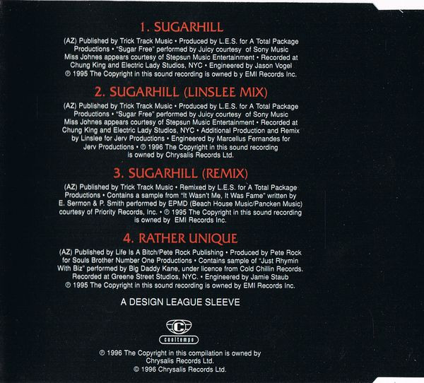‘Sugar Hill’ / ‘Sugarhill (Linslee Mix)’ / ‘Sugarhill (Remix)’ Produced by L.E.S. for A Total Package Productions. ‘Sugarhill’ and ‘Sugarhill (Linslee Mix)’ Contain a sample of ‘Sugar Free’ performed by Juicy courtesy of Sony Music Miss Johnes appears courtesy of Stepsun Music Entertainment Recorded at Chung King and Electric Lady Studios, NYC (p) 1995 The Copyright of this sound recording is owned by EMI Records Inc. ‘Sugarhill (Linslee Mix)’ Additional Production and Remix for Jerv Productions Engineered for Jerv Productions (p) 1995 The Copyright of this sound recording is owned by Chrysalis Records Ltd. ‘Sugarhill (Remix)’ Contains a sample from ‘It Wasn’t Me, It Was Fame’ written by E. Sermon & P. Smith performed by EPMD ‘Rather Unique’ Contains sample of ‘Just Rhymin With Biz’ performed by Big Daddy Kane Recorded at Greene Street Records, NYC (p) 1996 The Copyright in this compilation is owned by Chrysalis Records Ltd. Publisher ‘Paricken Music Inc.’ is printed as ‘Pancken Music’ in the credits for ‘Sugarhill (Remix)’ Publisher ‘Tricky Track Music’ is printed as ‘Trick Track Music’ in the credits for ‘Sugarhill’ and ‘Sugarhill (Linslee Mix)’