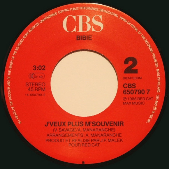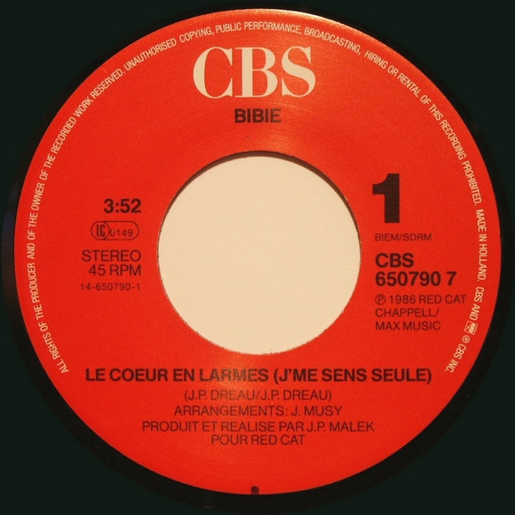 Bibie – Le Cœur En Larmes (J’me Sens Seule) (1987) – Very Good Plus (VG+)