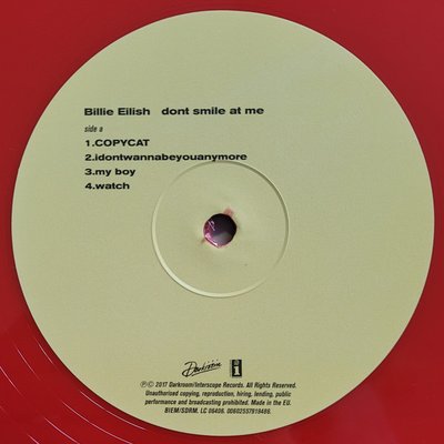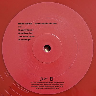 All Songs Mixed at The Fortress of Amplitude except ‘party favor’ and ‘ocean eyes’ Published by Drup (ASCAP) & Last Frontier (ASCAP) Administered by Kobalt Songs Music Music Publishing, except ‘ocean eyes’ and ‘watch’ published by Last Frontier (ASCAP) Administered by Kobalt Songs Music Music Publishing ℗© 2017 Darkroom/Interscope Records. Made in the EU. Universal International Music B.V. Tracks are listed as 1 to 8 on the sleeve. (Track durations are not listed on the record or sleeve). Red sticker on shrink wrap reads: Includes ‘ocean eyes’, ‘bellyache’, ‘COPYCAT’ and more 00602557919486
