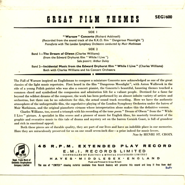 Charles Williams Concert Orchestra – Great Film Themes (1955) – Very Good (VG)