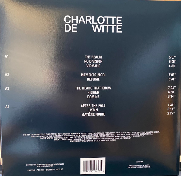 White vinyl, gatefold sleeve, printed thick inner sleeves with center holes. Artist and album name ‘Charlotte De Witte’ as seen on the image is only present on a transparant sticker on the seal and not printed on the front of the sleeve.