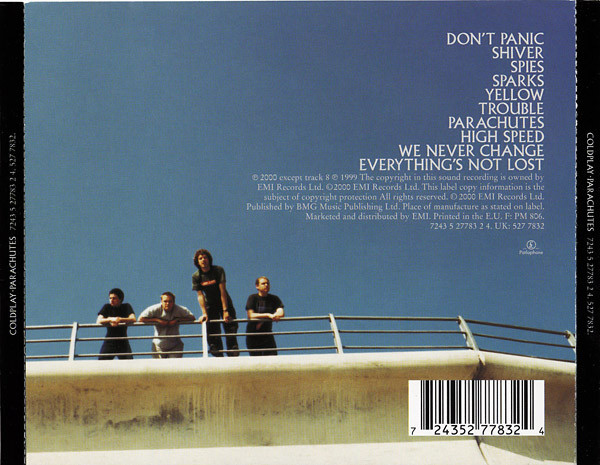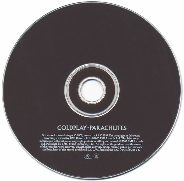 This release is different from [r=7979880] which was glass mastered at EMI Uden and pressed by Mediamotion, whereas this release was glass mastered and pressed by EMI Uden. N.B. a mould SID code beginning with 15 indicates that it most likely belongs to this release, whereas if it begins with AAH it could possibly belong to [r=7979880]. Comes in standard jewel case with black or clear tray. Includes an 8-page booklet. Mixed by Michael H. Brauer for MHB Productions. Mastered by George Marino at Sterling Sound. Recorded at intervals between November 1999 and May 2000 at Matrix, Wessex, Parr Street and Rockfield Studios, (except ‘High Speed’ recorded summer 1999 at Orinoco). The hidden track ‘Life Is For Living’ begins at the 5:39 mark of track #10 after a short period of silence (total #10 duration is 7:15). ℗ 2000, except track 8 ℗ 1999 The copyright of this sound is owned by EMI Records Ltd. © 2000 EMI Records Ltd. Published by BMG Music Publishing Ltd. [On back cover:] Marketed and distributed by EMI. Printed in the E.U. [On sleeve:] Made in EU. [On CD label:] Made in the E.U. Variant 6 includes stiff flyer for ‘Coldplay Live 2003 DVD’ on one side and reverse lists Parachutes, A Rush Of Blood To The Head, and Coldplay Live. Flyer has code of CPLIVE2.