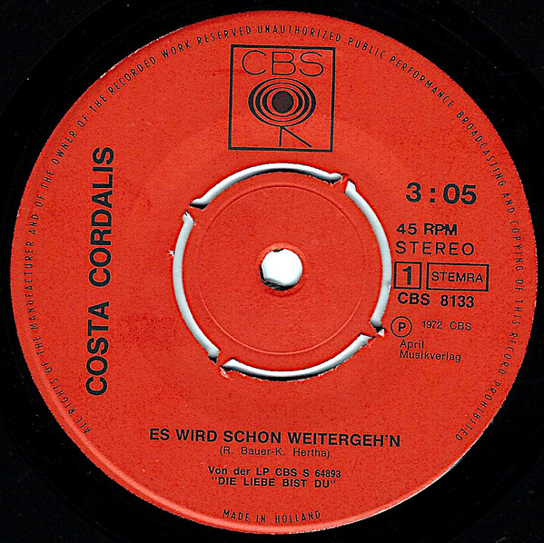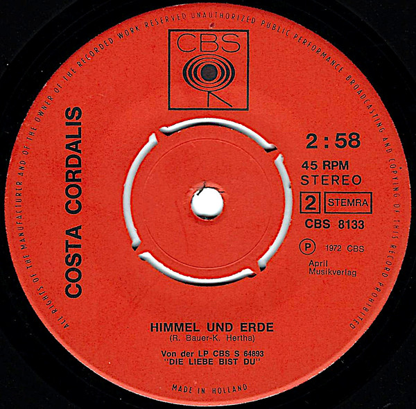 MADE IN HOLLAND Printed in Holland Von der LP CBS S 64893 ‘DIE LIEBE BIST DU’ Runouts are etched