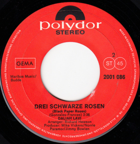 On sleeve (both sides): Original Festival International (London) Recording On back sleeve: Brandheiß: Daliah Lavi’s [url=https://www.discogs.com/master/484659-Daliah-Lavi-Liebeslied-Jener-Sommernacht]erste LP[/url]! On labels: Made in Germany Deutsche Grammophon Ges. mbH·Regd·Tr·M A: Essex Music/Gerig B: Maribus Music/Budde Runout information: The runouts are stamped, the stamper letters are rotated by 90°. Cutting date from runout code: Augist 1970. Variant information: A [url=https://www.discogs.com/release/2467948-Daliah-Lavi-Oh-Wann-Kommst-Du-Drei-Schwarze-Rosen]very similar variant[/url] has a slightly different photography on front sleeve. Additional information: Side A: German cover version of [m794863] Side B: German cover version of [url=https://www.discogs.com/de/master/1009040-Cilla-Black-Across-The-Universe]Cilla Black – ‘Black Paper Roses'[/url]