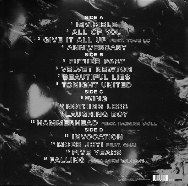Gatefold sleeve. Printed inners. Two art booklets. Runouts are etched. Some geometrical marks are mirrored. ‘Made in CZ’ on labels. ‘Made in Germany’ on sleeve back. Tracks are numbered 1 to 16 on the release.