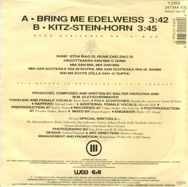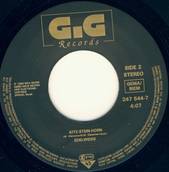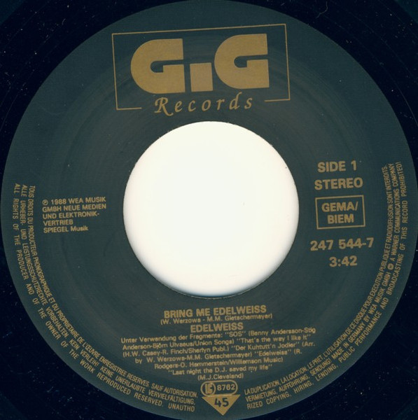 Duration for Track B incorrect on sleeve (3:45). Similar versions: [url=https://www.discogs.com/Edelweiss-Bring-Me-Edelweiss-A-Sound-Attack-Straight-From-The-Alps/release/5965779]This version[/url] has a solid center with the corrected catalog number ‘YZ 353’ on the label. [url=https://www.discogs.com/Edelweiss-Bring-Me-Edelweiss/release/5730933]This version[/url] has no catalog number ‘Y 2353’ on the back sleeve. [url=https://www.discogs.com/Edelweiss-Bring-Me-Edelweiss/release/9844660]This version[/url] has catalog number ‘YZ 353’ on the back sleeve. Labels: ℗ 1988 WEA Musik GmbH Neue Medien und Elektronikvertrieb Spiegel Musik Made in Germany by WEA Musik GmbH [Warner logo] A Warner Communications Company Sleeve: This record is dedicated to [a1611714] Folk Scratches: […] courtesy by [url=https://www.discogs.com/artist/713120-First-Vienna-DJ-Team?filter_anv=1&anv=Vienna+DJ+Team]Vienna DJ Team[/url] Preproduction at TonArt, Vienna Recorded at Unique Studios, New York City Postproduction at Paradise Studios, Munich Copyright-Info for the A-side: ‘[m=37997]’ (Union Songs) · ‘[url=https://www.discogs.com/KC-And-The-Sunshine-Band-Thats-The-Way-I-Like-It-Aint-Nothin-Wrong/master/159067]That’s The Way I Like It[/url]’ (Sherlyn Publ.) · ‘[url=https://www.discogs.com/Das-Sonora-Trio-Kuhtutten-Jodler/release/8215179]Der Kuhtutt’n Jodler[/url]’ · ‘[url=https://www.discogs.com/Leland-Hayward-Richard-Halliday-Richard-Rodgers-Oscar-Hammerstein-2nd-Present-Mary-Martin-The-Sound-/master/193843]Edelweiss[/url]’ (Williamson Music) · ‘[url=https://www.discogs.com/Indeep-Last-Night-A-DJ-Saved-My-Life/master/77899]Last Night The D.J. Saved My Life[/url]’ · ‘Bring Me Edelweiss’ Copyright-Info for the B-side: ‘Kitz-Stein-Horn’ ℗ + © 1988 GiG Records, WEA Musik GmbH, Neue Medien und Elektronikvertrieb [Warner logo] A Warner Communications Company Manufactured in Germany. Pressé en Allemagne. Teldec Record Service GmbH [Warner logo] A Warner Communications Company Additional runout information: Runouts are hand-etched except for the stamped matrix # ‘R/S Alsdorf 247544-7-A/B’.