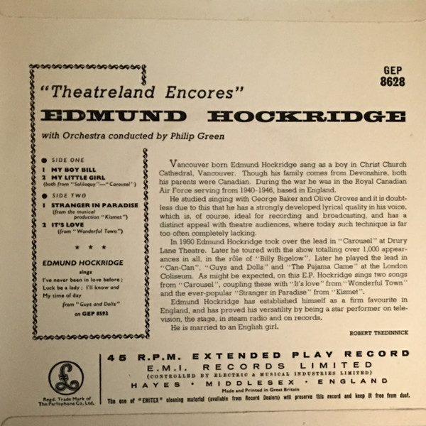 Edmund Hockridge – Theatreland Encores (1957) – Very Good (VG)