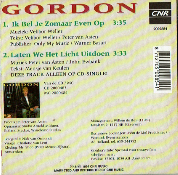 Track 1 is taken from the album ‘Alles Wat Ik Ben’. Track 2 is a previously unreleased track. ℗ & © 1994 CNR Music Marketed and Distributed by CNR Music Van de CD / MC CD [url=https://www.discogs.com/Gordon-Alles-Wat-Ik-Ben/release/3935272]2000483[/url] MC 2000484 Issued in a Cardboard Sleeve