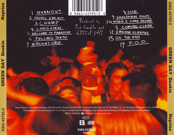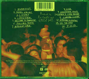 Green case is Warner branded. Booklet: All music © 1994 Green Daze Music ASCAP except ‘Welcome To Paradise’ © 1991 Green Daze Music ASCAP. Disc Face: All music ASCAP ©℗ 1994 Reprise Records, a Time Warner Company. Back Cover: © ℗ 1994 Reprise Records for the U.S. and WEA International Inc. for the world outside of the U.S. Made in Germany. Ernie © Jim Henson Productions, Inc. In the booklet, a separator is placed above track 8; ‘←East Beast West Beast →’. Tracks 7 & 8 is the cutoff point for the two clusters of songs on the back of the case, as well as the A and B-sides of the vinyl version. Track 14.2 is a hidden track starting 4:08 into track 14, total duration 5:47.