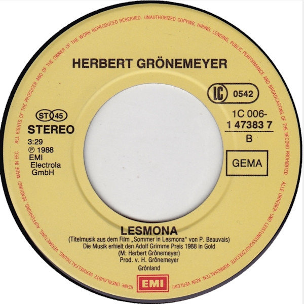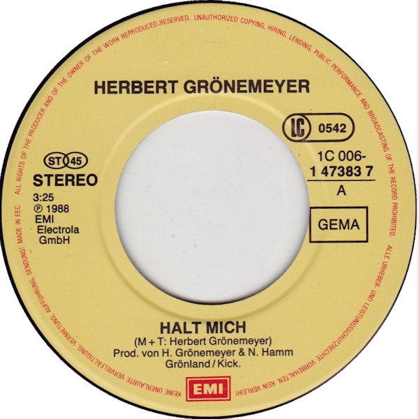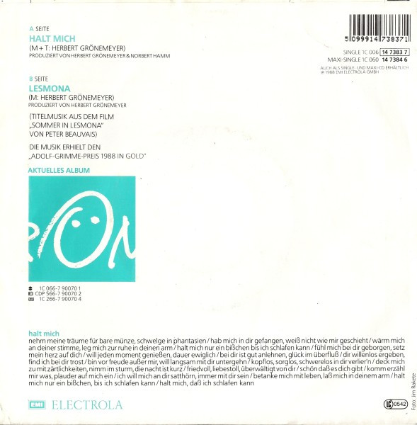 Track B: Titelmusik aus dem Film ‘Sommer in Lesmona’ von Peter Beauvais. Die Musik erhielt den ‘Adolf-Grimme-Preis 1988 in Gold’. [url=http://www.discogs.com/release/492368]Maxi-Single[/url] 1C 006 147384 6 Auch als [url=http://www.discogs.com/Herbert-Gr%C3%B6nemeyer-Halt-Mich/release/3755259]Single-[/url] und [url=http://www.discogs.com/Herbert-Gr%C3%B6nemeyer-Halt-Mich/release/1925051]Maxi-CD[/url] erhältlich. ℗ 1988 EMI Electrola GmbH Aktuelles album ‘Ö’ [url=http://www.discogs.com/Herbert-Gr%C3%B6nemeyer-%C3%96/release/532946]LP[/url] 1C 066-7 90070 1 [url=http://www.discogs.com/release/1875237]CD[/url] CDP 566-7 90070-2 Cass. 1C 266-7 90070-4 Song lyrics of ‘Halt Mich’ printed on back sleeve. EMI Electrola [logo] [Labels] Track A: Grönland/Kick. Track B2: Grönland Made in EEC