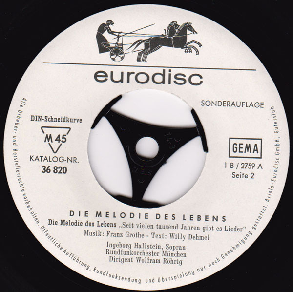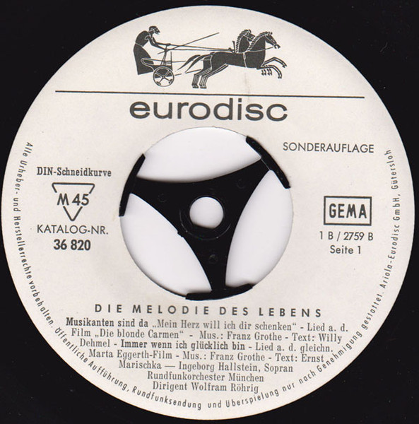 Sonderauflage A1: Lied a. d. Film „Die Blonde Carmen“ A2: Lied a. d. gleichn. Marta-Eggerth-Film B: Lied für Koloratursopran und Orchester DIN-Schneidkurve Ariola-Eurodisc GmbH , Gütersloh Printed in Western Germany TELDEC-Press GmbH order pressing. Matrix indicators are swapped for Seite1/Seite2 (B/A). Mid-to-late 1960s edition.