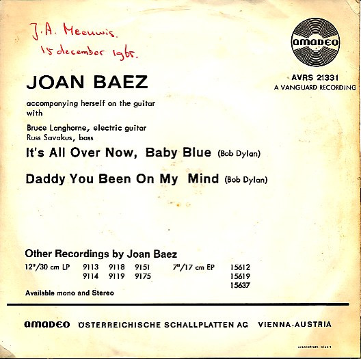 Joan Baez – It’s All Over Now, Baby Blue (1965) – Very Good Plus (VG+)