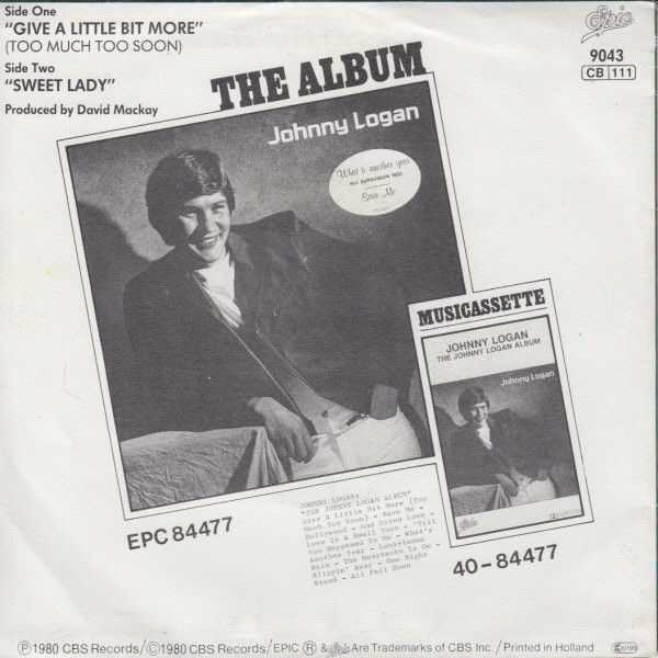 Johnny Logan – Give A Little Bit More (Too Much Too Soon) (1980) – Very Good Plus (VG+)