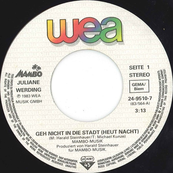 Juliane Werding – Geh Nicht In Die Stadt (Heut Nacht) (1984) – Very Good Plus (VG+)