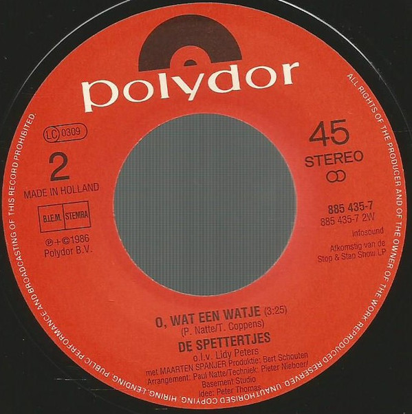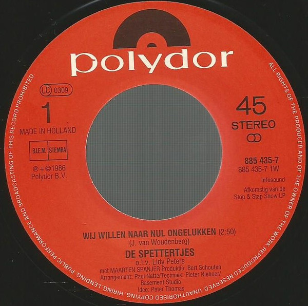 Kinderkoor De Spettertjes – Wij Willen Naar Nul Ongelukken / O… Wat Een Watje (1986) – Very Good Plus (VG+)
