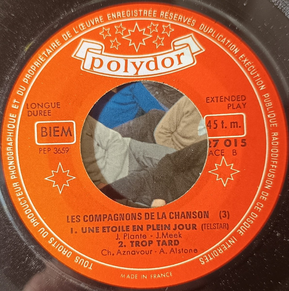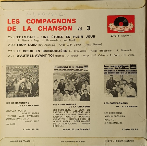 ‘Les Compagnons De La Chanson Vol. 3.’ on back cover On labels: Made in France Labels have been reversed (‘Le Cœur En Bandoulière’ and ‘D’autres Avant Toi’ are on side A). Runouts are etched.