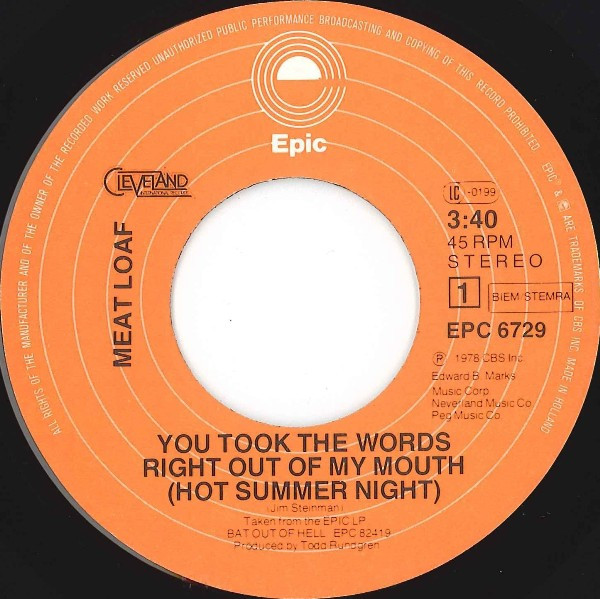 Meat Loaf – You Took The Words Right Out Of My Mouth (Hot Summer Night) (1978) – Very Good Plus (VG+)