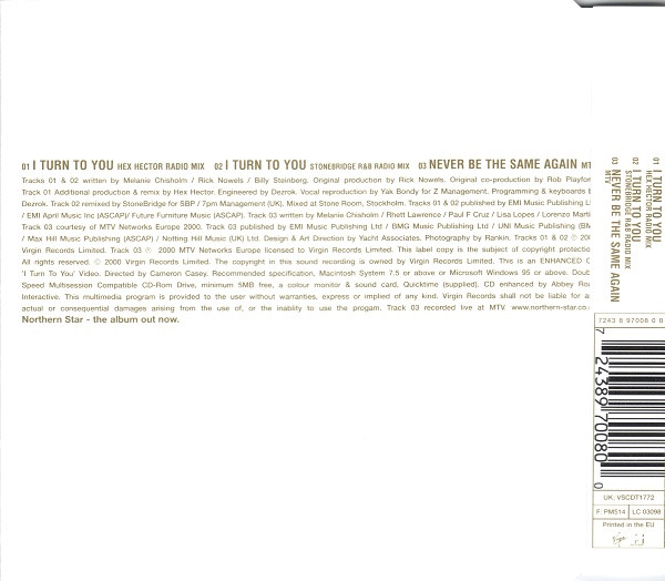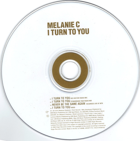 I Turn To You Published by EMI Music Publishing Ltd. / EMI April Music Inc (ASCAP) / Future Forniture Music (ASCAP). Never Be The Same Again Published by Max Hill Music Publishing (ASCAP) / Nothing Hill Music (UK) Ltd. Track 1: Vocal Reproduction for Z Management. Track 2 remixed for SBP / 7pm Management (UK). Track 3 courtesy of MTV Networks Europe 2000. Published by EMI Music Publishing Ltd / BMG Music Publishing Ltd / UNI Music Publishing (BMI) / Max Hill Music Publishing (ASCAP) / Nothing Hill Music (UK) Ltd. Tracks 1 & 2: ℗ 2000 Virgin Records Limited. Track 3: ℗ 2000 MTV Networks Europe Licensed to Virgin Records Limited. Recorded live at MTV © 2000 Virgin Records Limited Printed in the EU. Made in the EU. Issued in a j-card case. A very [url=https://www.discogs.com/Melanie-C-I-Turn-To-You/release/131705]similar edition[/url] with the same barcode and catalogue number was pressed in the UK by [l45238].