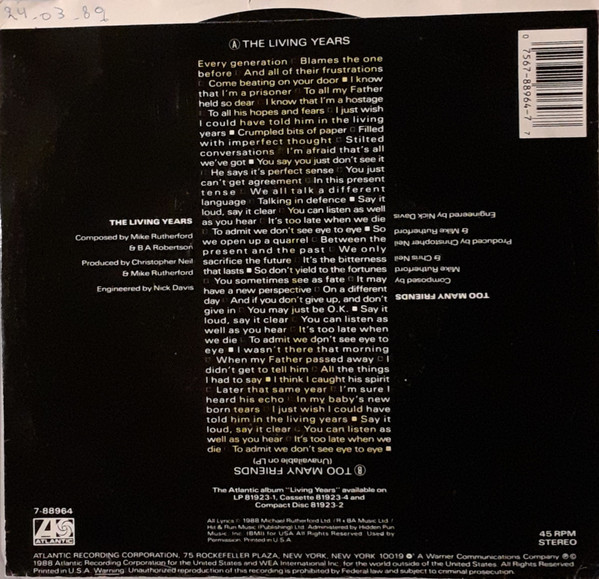 Mike & The Mechanics – The Living Years (1988) – Very Good Plus (VG+)