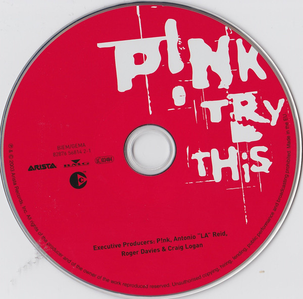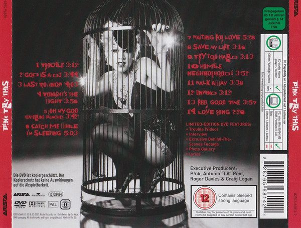 Made in the EU. Custom sticker: ‘P!NK – TRY THIS – LTD EDITION includes Bonus DVD featuring Trouble video, An Interview with P!nk, Lyrics, Photogallery and exclusive footage. 82876 56814 2′ Differs from another Europe CD+DVD Limited Edition set [r=464231] release due to the addition of the BBFC (UK) Age Control Certificate ’12’ notice box added on the DVD and the reverse/tray inlay. CD-15 is a hidden track. Tracks 1, 3 to 5, 8, 10 to 12 published by P!nk Inside Publishing/EMI Blackwood Music Inc. (BMI)/How About A Bunch Of Trouble Music (ASCAP) Track 2 published by P!nk Inside Publishing/EMI Blackwood Music Inc. (BMI)/Sony/ATV/Turtle Victory Music (SESAC)/Sony ATV Tunes LLC/Love Bud Inc. (ASCAP) Tracks 6, 9 published by P!nk Inside Publishing/EMI Blackwood Music Inc. (BMI)/Stuck In The Throat/Famous Music Corp. (ASCAP) Track 7 published by P!nk Inside Publishing/EMI Blackwood Music Inc. (BMI)/Stuck In The Throat/Famous Music Corp./Rocket Seed, adm. by Kobalt Music Services/Paul Ill Music (ASCAP)/Pick Your Parts Music (BMI), adm. by Wixen-Polin Track 13 published by Rondor Music (London) Ltd. admin. by Almo Music Corp. (PRS); Beck Hansen’s Music Publishing Designee;Hollenbeck Music admin. by Irving Music Corp. (BMI) Track 14 published by P!nk Inside Publishing/EMI Blackwood Music Inc. (BMI)/DWE Music/WB Music Corp. (ASCAP)