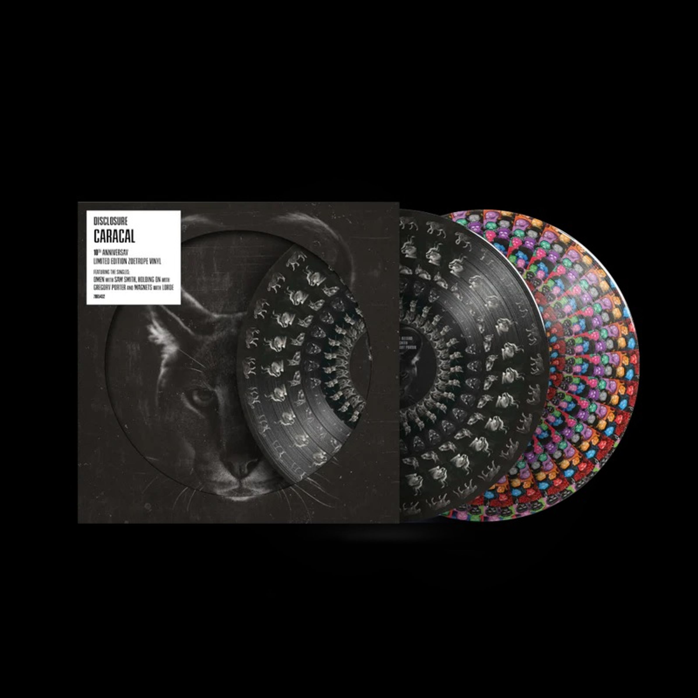 Item has not been released yet, probable delivery date is 20.2.2026. You can order the title now. It will be dispatched to you as soon as it is available. No more insider tips: Disclosure are the dance sensation of the year. After being nominated for a Grammy in the ‘Best Dance Recording’ category with their single ‘F For You feat. Mary J. Blidge’ earlier this year, the British brothers Guy and Howard Lawrence are now shaking up the dance scene once again with their new album ‘Caracal’. The album includes ‘Holding On feat. Gregory Porter’ and the current single ‘Omen feat. Sam Smith’. Caracal’ also features superstars such as The Weeknd, Kwabs, Lorde, LION BABE and Sam Smith, who was already featured on Disclosure’s worldwide hit ‘Latch’ from the debut album ‘Settle’. The album Caracal will be released as CD, limited deluxe CD with 3 bonus tracks in a digipack and as 2 LP. To celebrate the 10th anniversary of Disclosure’s second studio album, Caracal is released on Zoetrope Vinyl! This album features an eclectic selection of vocal collaborations including The Weeknd, Sam Smith, Gregory Porter, Lorde, Jordan Rakei and many more. With five singles in total, the acclaimed second single ‘Omen’ featuring Sam Smith was the highest charting single, peaking at number 13 in the UK charts and has received almost 1 billion streams worldwide since its release. The Lorde-featured track ‘Magnets’ follows closely behind with almost 710 million streams since its release. Caracal has sold over 135,000 copies worldwide since its release and was nominated for a Grammy in the ‘Best Dance / Electronic Album’ category in 2016. The limited edition will be available for the first time on a 2LP Zoetrope, housed in a gatefold die cut sleeve. Each side of the vinyl is inspired by the original album artwork and then-campaign poster, using the caracal cat and the singer’s illustrations to create animated movement on the disks as they spin.