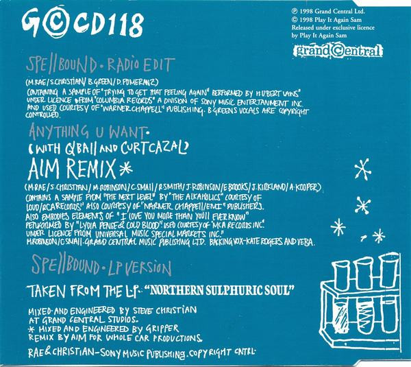 Track 1 containing a sample of ‘Trying To Get That Feeling Again’ performed by Hubert Laws under license from Columbia Records a division of Sony Music Entertainment Inc. and used courtesy of Warner Chappell Publishing. B. Green’s vocals are copyright controlled. Track 2 contains a sample from ‘The Next Level’ by ‘The Alkaholics’ courtesy of Loud/RCA Records, also courtesy of Warner Chappell/EMI Publishers. Also embodies elements of ‘I Love You More Than You’ll Ever Know’ performed by ‘Lydia Pense & Cold Blood’ used courtesy of MCA Records, Inc. under license of Universal Music Special Markets Inc. M. Robinson/C. Small Grand Central Music Publishing Ltd. Track 1 and 3 mixed and engineered at Grand Central Studios. Track 2 remixed for Whole Car Productions. Rae & Christian – Sony Music Publishing Copyright Control.
