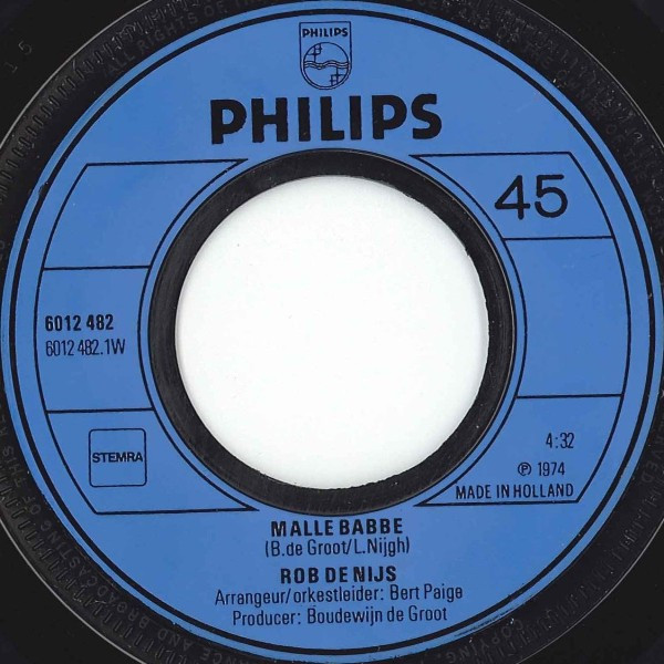 The back of the sleeve contains the lyrics of ‘Malle Babbe’. ℗ 1974 Made In Holland Uit de succesvolle LP: In De Uren Van De Middag [url=http://www.discogs.com/Rob-de-Nijs-In-De-Uren-Van-De-Middag/release/8881688]6413 053[/url] ook op MC verkrijgbaar