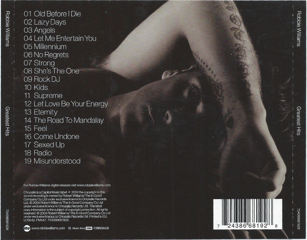Reissue of [r=2288844] made by www.mediamotion.com Studios Abbey Road, Air Lyndhurst, Angel, Battery, Blah Street, Conway, Jacobs, Masterock, Matrix Maison Rouge, Mix This!, Sarm Hook End, Swanyard, The Record Plant, The Townhouse, Trident II, Wheeler End. Mastered at Metropolis Studios, London. Publishing 1: EMI Music Publishing Ltd/Polygram International Music Ltd – MCPS/Human Boy (administered by WB Music Corp)/Desmophobia. 2 to 4, 6, 7, 10, 12 to 15, 17: EMI Music Publishing Ltd/BMG Music Publishing Ltd. 5: EMI Music Publishing Ltd/BMG Music Publishing Ltd/EMI Music Partnership Ltd. 8: Polygram Music Publishing Ltd. 9: EMI Music Publishing Ltd/BMG Music Publishing Ltd/Hit And Run Music Publishing Ltd/Ba Dake Music Inc. 11: EMI Music Publishing Ltd/BMG Music Publishing Ltd/Universal Music Publishing Ltd. 16: BMG Music Publishing Ltd/Twenty Seven Songs/EMI Music Publishing Ltd. 18, 19: BMG Music Publishing Ltd/Copyright Control. Chrysalis is a Capitol Music label. ℗ 2004 The copyright in this sound recording is owned by Robert Williams/The In Good Co Ltd under exclusive licence to Chrysalis Records Ltd. © 2004 Robert Williams/The In Good Co Ltd under exclusive licence to Chrysalis Records Ltd. Printed in the EU.