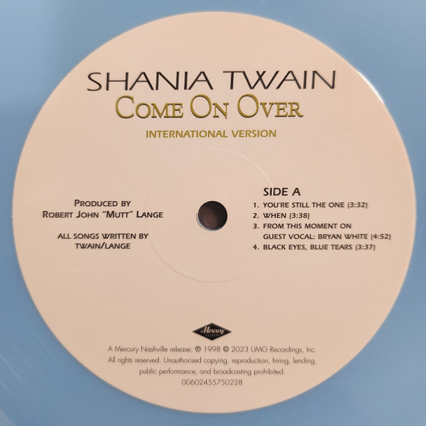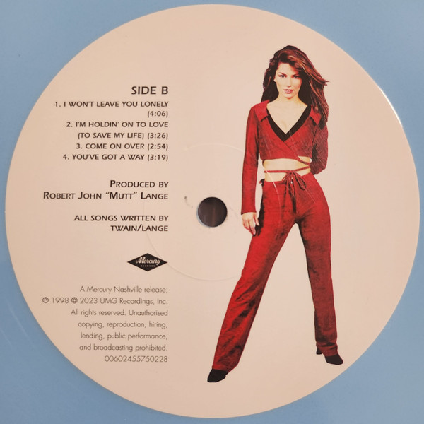 International Pop version Hype sticker reads: 25th Anniversary Diamond Edition The top-selling country album and highest-sold female album of all time! Newly remastered International Pop version on vinyl for the first time! Pressed on 2 x 180-gram blue vinyl! Track D1’s time is incorrectly listed as 3:39 on back cover, but correctly on the labels, with an actual running time of 3:59. Made in Czech Republic sticker on the back. First labelnumber on back sleeve: 00602455654380 Second labelnumber on labels LP1: 00602455750228 Third labelnumber on labels LP2: 00602455750242 Track A3 does not feature Bryan White, this version is ‘The Right Version’ or The I.V. Mix in Australia. Shania solo. Track B4 is called (Notting Hill Remix) in the gatefold. Track D1 is called (UK Dance Mix) in the gatefold. Runouts are stamped. This version is also sold in Australia.