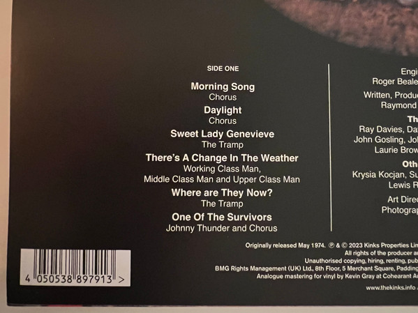 Hype sticker reads: The Kinks 60 – The Kinks – Preservation Act I – The Classic 1973 Album – Heavyweight Black Vinyl LP – Original Artwork Replicated – Includes One Of The Survivors, Sitting In The Midday Sun, Sweet Lady Genevieve, Daylight. Includes two sided printed insert with lyrics. Manufactured in France. Runouts are etched.