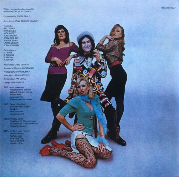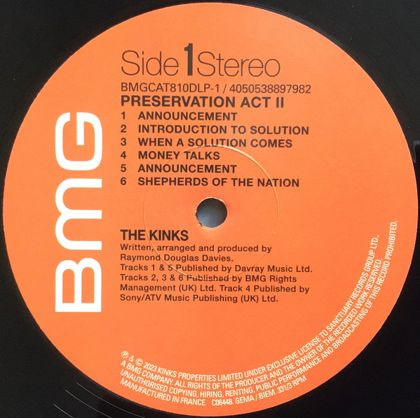 Hype sticker reads: The Kinks 60 – The Kinks Preservation Act 2 – The Classic 1974 Album – Heavyweight Black Vinyl 2LP – Original Artwork Replicated – Includes Money Talks, He´s Evil, Mirror Of Love, Artificial Man. Includes four sided printed insert with lyrics. Manufactured in France. Runouts are etched.