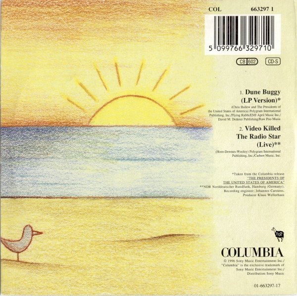 Housed in a cardboard sleeve. [Back cover:] 1: Polygram International Publishing, Inc./Flying Rabbi/EMI April Music Inc./David M. Federer Publishing/Raw Poo Music 2: Polygram International Publishing, Inc./Carbert Music, Inc. *[1] Taken from the Columbia release ‘[url=https://www.discogs.com/release/1646123-The-Presidents-Of-The-United-States-Of-America-The-Presidents-Of-The-United-States-Of-America]The Presidents Of The United States Of America[/url]’ **[2] NDR Norddeutscher Rundfunk, Hamburg (Germany) © 1996 Sony Music Entertainment Inc./ ‘Columbia’ is the exclusive trademark of Sony Music Entertainment Inc./ Distribution Sony Music [Disc:] © 1996 Sony Music Entertainment Inc./ ℗ 1995, 1996 PopLlama Products, Reproduced under Exclusive License. Made in Austria