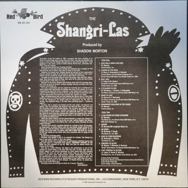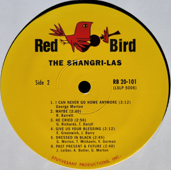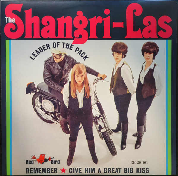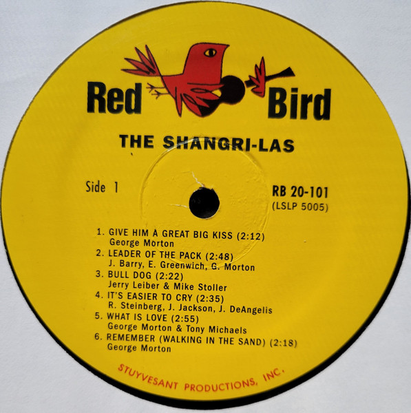 Although the cover’s spine states that this album is entitled ‘Leader of the Pack’, the Red Bird labels only state ‘The Shangri-Las’. Reissue with no indication of year of release. Both A-side and B-side labels show correct track list. Similar sleeve and runouts to [r10100861], but this version has the correct track listing for side B and both labels have text ‘STUYVESANT PRODUCTIONS, INC.’ in red ink around the bottom rim. Also different from [r4663951] as this version has text ‘RB 20-101’ above ‘BIG KISS’ on the front sleeve. All runouts are etched; there is an indecipherable cursive scrawl in each side’s runouts. 1.25′ pressing rings. A Kama Sutra Production.
