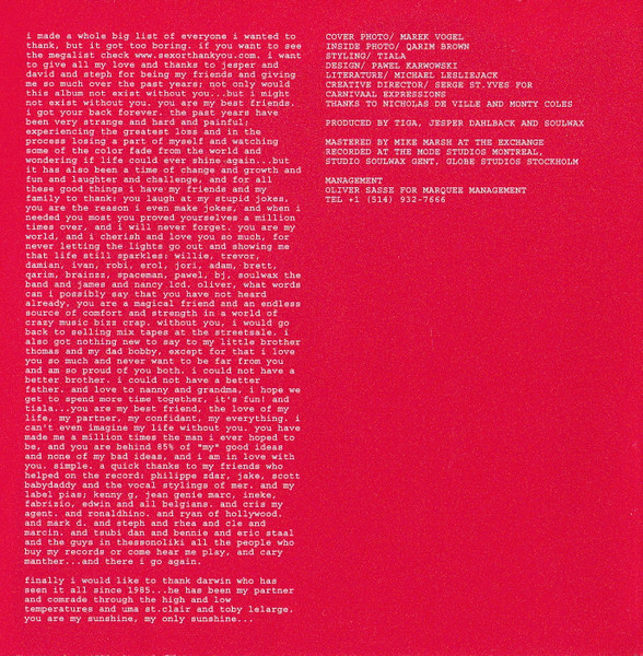 Special Collectors Edition with a second disc of unreleased tracks & videos. Mastered at The Exchange. Recorded at The Mode Studios – Montreal, Studio Soulwax – Gent & Globe Studios – Stockholm After about 2 minutes of silence after the end of Brothers a message from Tiga’s answering machine can be heard followed by the track Sir Sir Sir. About 5 minutes after this track another message from the answering machine can be heard. Total length of track 14 is 17:08. © 2007/ Different/ Play It Again Sam [PIAS] ℗ 2007/ 3201937 Canada Inc./ Tiga /Uma Was Here