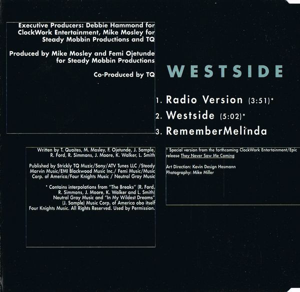 From the forthcoming album [m=162232] Executive Producers: Debbie Hammond for ClockWork Entertainment, Mike Mosley for Steady Mobbin Productions Published by Strickly TQ Muzic / Sony/ATV Tunes LLC / Steady Marvin Music / EMI Blackwood Music Inc. / Femi Music / Music Corp. of America / Four Knights Music / Neutral Gray Music Track 1 & 2: Contains interpolations from ‘[m=85512]’ (R. Ford, R. Simmons, J. Moore, K. Walker, and L. Smith) Neutral Gray Music and ‘In My Wildest Dreams’ (J. Sample) Music Corp. of America obo itself Four Knights Music. © 1998 ClockWork Entertainment, Inc., Sony Music Entertainment Inc./ ℗ 1998 ClockWork Entertainment, Inc., Sony Music Entertainment Inc. Distribution Sony Music Made in Austria.