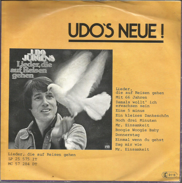 Sleeve: Eine Produktion im Auftrag der Edition Montana Labels: Hi-Fi A: Udo Jürgens Music B: Ed. Montana Eine Joachim Heider/Udo Jürgens-Produktion im Auftrag der Edition Montana ‘Udo’s Neue! Lieder, die auf Reisen gehen’ [url=https://www.discogs.com/release/629524-Udo-J%C3%BCrgens-Lieder-Die-Auf-Reisen-Gehen]LP 25 575 IT[/url] [url=https://www.discogs.com/release/14433862-Udo-J%C3%BCrgens-Lieder-Die-Auf-Reisen-Gehen]MC 57 284 DT[/url] Runouts are stamped, except for the hand-etched roman number on the end of the string, if present.