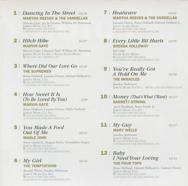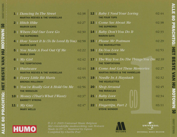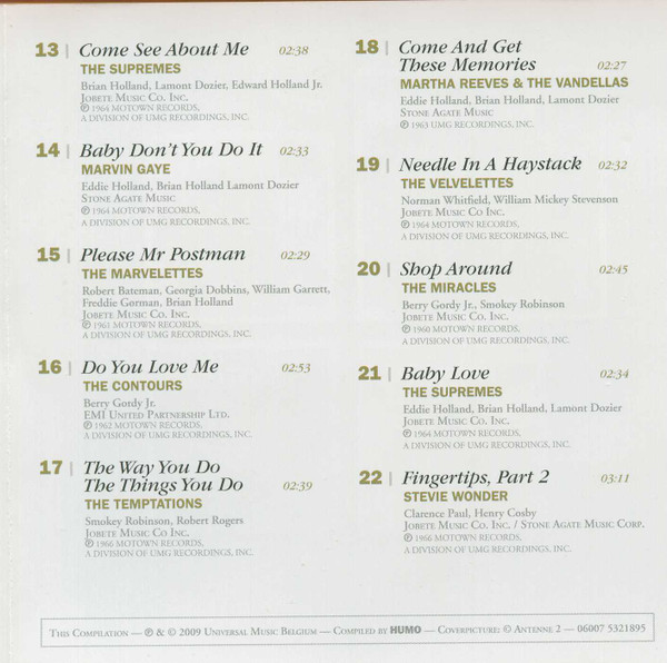 Sold with Humo Magazine. ℗&© 2009 Universal Music Belgium Made in EU. Publishers: Tracks 1, 4 to 6, 9, 10, 13, 15, 17, 19 to 21 : Jobete Music Co. Inc. Tracks 2, 23 : Jobete Music Co. Inc. / Stone Agate Music Tracks 3, 11, 12 : Jobete Music Ltd. Tracks 7, 8, 14, 18 : Stone Agate Music Track 16 : EMI United Partnership Ltd.