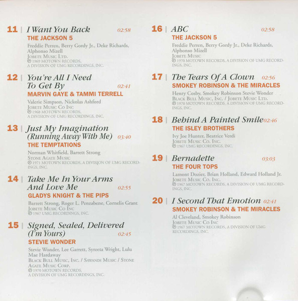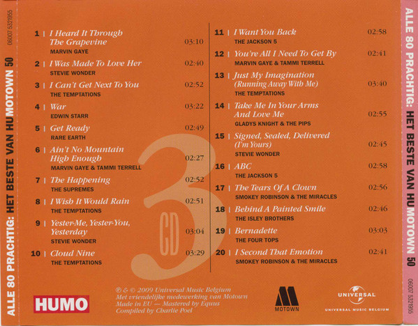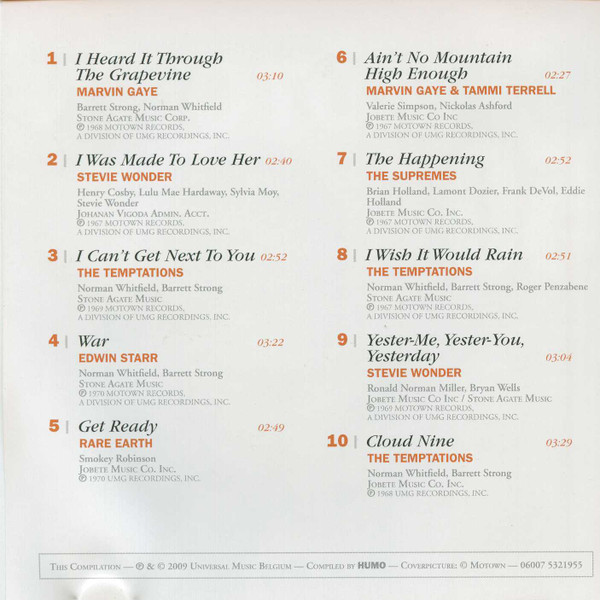 Sold with Humo Magazine. This Compilation ℗&© 2009 Universal Music Belgium Publishers: Track 1 : Stone Agate Music Corp. Track 2 : Johanan Vigoda admin. Acct. Tracks 3, 4, 8, 13 : Stone Agate Music Tracks 5 to 7, 10, 12, 14, 18 to 20 : Jobete Music Co. Inc. Track 9 : Jobete Music Co Inc / Stone Agate Music Track 11 : Jobete Music Ltd. Track 15 : Black Bull Music, Inc. / Sawandi Music / Stone Agate Music Corp. Track 16 : Jobete Music Track 17 : Black Bull Music, Inc. / Jobete Music Ltd.