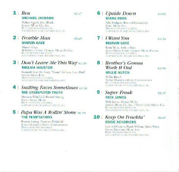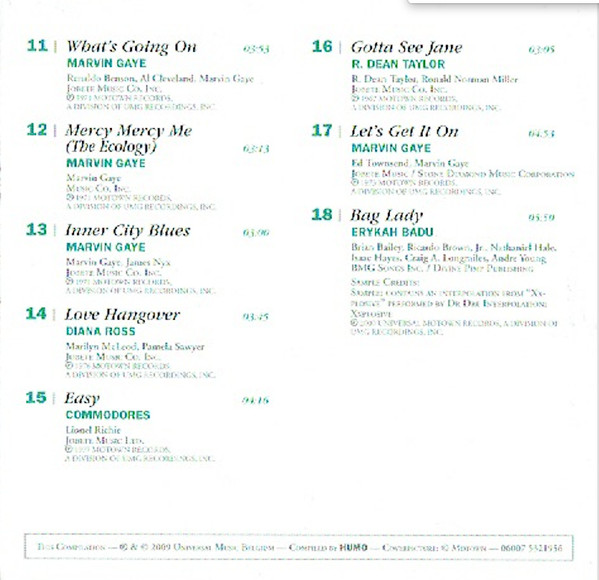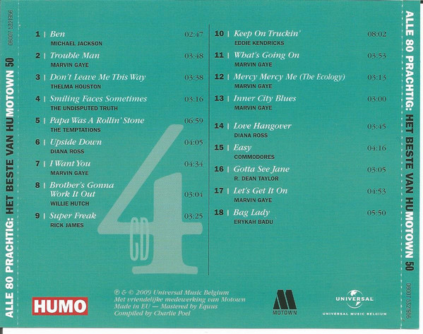 Sold with Humo Magazine. The duration of track 10 is printed incorrectly as 8:02. Track 18 contains an interpolation from ‘Xxplosive’ performed by [a=Dr Dre]. This Compilation ℗ & © 2009 Universal Music Belgium Made in EU. Publishers: Tracks 1, 11 to 14, 16 : Jobete Music Co. Inc. Track 2 : WB Music Corp. / Jobete Music Co Inc Track 3 : Island Music Ltd. Track 4 : Stone Agate Music Tracks 5, 8 : Stone Diamond Music Corporation Track 6 : Chic Music Inc. Track 7 : Almo Music Corp. / Jobete Music Co Inc Track 9 : Jobete Music Co. Inc. / Stone City Music Co. Track 10 : Stone Diamond Music Inc. Track 15 : Jobete Music Ltd. Track 17 : Jobete Music / Stone Diamond Music Corporation. Track 18 : BMG Songs Inc. / Divine Pimp Publishing