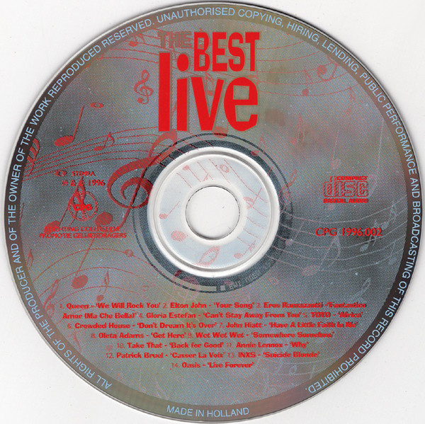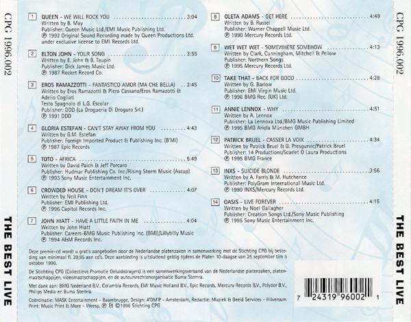 This compilation consists of only live-recordings. Below is a translation of the Dutch explanation (can be found on the back of the CD) of why this CD was released: This bonus-CD is presented by the Dutch record stores in cooperation with the ‘Stichting CPG’ when a minimum of fl. 39,95 (Dutch guilders) is spend on CD’s. This offer is valid during the ‘Muziek 10-daagse’ from the 25th of september untill the 5th of oktober 1996. Coördinatie: Mask Entertainment – Braambrugge Design A’DM’P – Amsterdam Redactie: Muziek & Beeld Services – Hilversum Print: Music Print & More – Weesp ℗ & © 1996 Stichting CPG Contains a CDi-part with a promoclip and internet links.