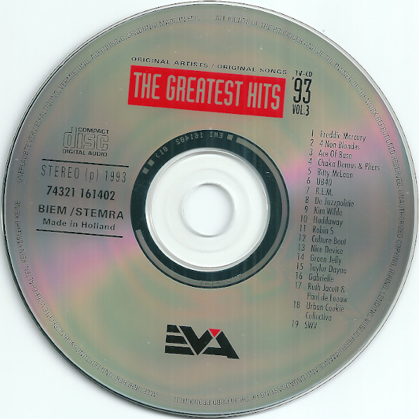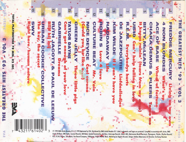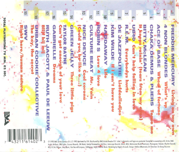 (P) 1993 BMG Ariola Benelux B.V. © 1993 Marketed by EVA. Made in Holland. Distributed by BMG Ariola Benelux B.V. Versions appearing on this release: Track 1 is Living On My Own (Radio Mix) Track 2 is What’s Up? (Edit) Track 3 is Wheel Of Fortune (7′ Mix) Track 4 is Tease Me (Radio Edit) Track 5 is It Keeps Raining’ (Radio Edit) Track 6 is (I Can’t Help) Falling In Love With You Track 7 is misspelled on the release as Everybodys Hurts Track 8 is labelled correctly Track 9 is an edit of If I Can’t Have You (7′ Edit), which is about ten seconds shorter than the single version Track 10 is Life (Radio Edit) Track 11 is a slightly shorter version of Luv 4 Luv (Stone’s Radio Edit) Track 12 is Mr. Vain (Album Version) Track 13 is Cool Corona (Album Version) Track 14 is Three Little Pigs (Full Length Version) Track 15 is Can’t Get Enough Of Your Love (Single Version) Track 16 is Dreams (7′ Version) Track 17 is Blijf Bij Mij (Live Met Publiek) Track 18 is The Key : The Secret (Glamourously Developed Edit) Track 19 is Right Here (Human Nature Radio Mix)