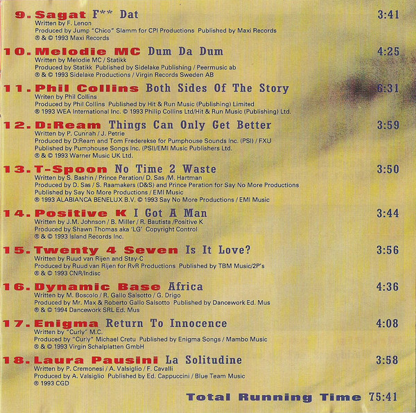 ® 1994 Warner Music Netherlands BV Made in Germany. These are the versions that actually appear on this CD: Track 1 is I’d Do Anything For Love (But I Won’t Do That) (Radio Edit) Track 2 is Never Alone (Euro Radio Mix) Track 3 is Anything (Radio Converted) Track 4 is labelled correctly Track 5 is What’s My Name? (LP Version) Track 6 is Let The Beat Control Your Body (Airplay Edit) Track 7 is U Got 2 Let The Music (DJ Pierre Edit) Track 8 is Babe (Return Remix) Track 9 is Funk Dat (Original Edit) Track 10 is Dum Da Dum (Radio Version) Track 11 is Both Sides Of The Story (Full Length) with a slightly shorter fade Track 12 is Things Can Only Get Better (D·Reamix Edit) Track 13 is No Time 2 Waste (7′ Radio Version) Track 14 is I Got A Man (Original Version) Track 15 is Is It Love (Single Mix) featuring Stay-C and Nance Track 16 is Africa (Vocal Dance Version) Track 17 is Return To Innocence (Radio Edit) Track 18 is labelled correctly Right barcode added